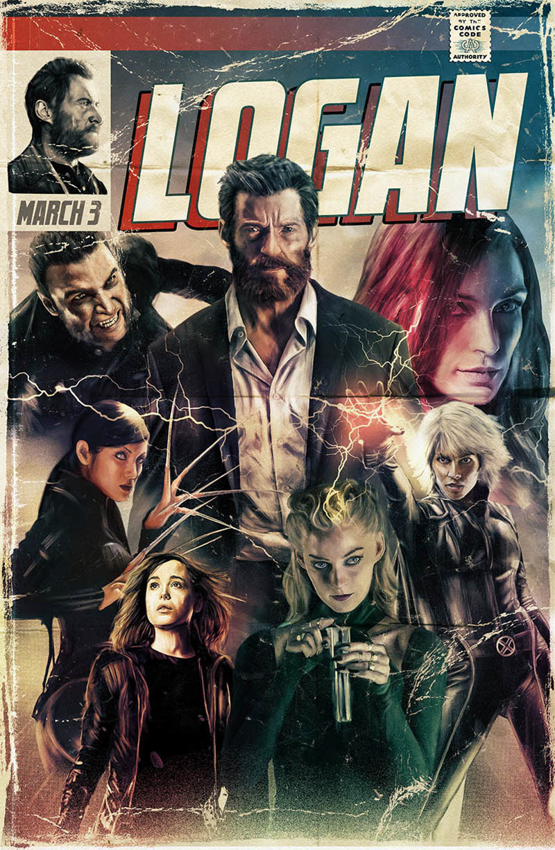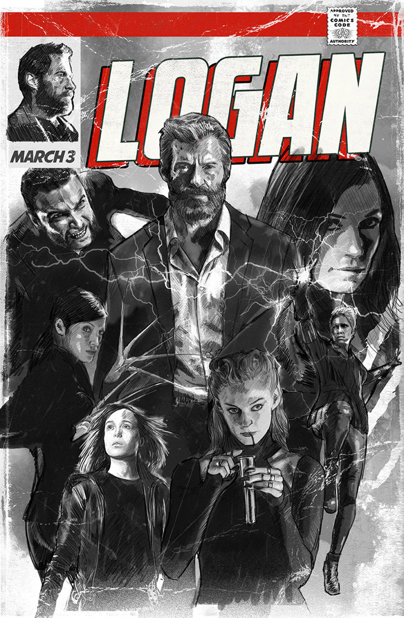 Promotional artwork created in collaboration with 20th Century Fox and the Poster Posse agency to promote the movie Logan via various social media channels. The brief was to illustrate the main character of Logan and the various influential characters that have played a part in his story arc over 9 films.